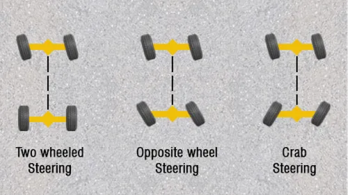 4 Wheel steering system allows maneuverability in narrow space and allows for tight turning radius. Crab steering enables side maneuverability.